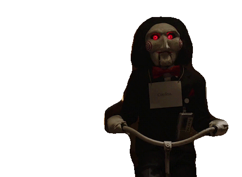 The iconic Jigsaw puppet from Saw, Billy, rides a tricycle, wearing a tag that ominously reads 'Confess'.