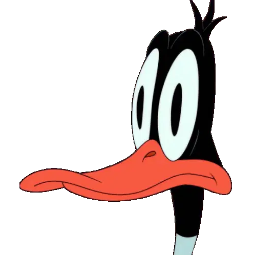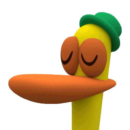 Pato, the yellow duck from Pocoyo, looks confused with wide eyes and a green hat. A funny reaction.