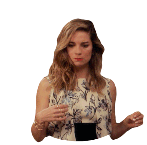 Alexis Rose from Schitt's Creek looks utterly confused and perplexed, expressing a baffled reaction with slightly raised hands.