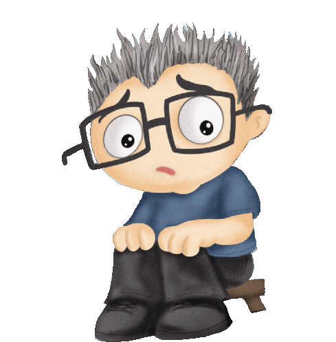 A cute cartoon character with spiky gray hair and glasses sits, looking confused, sad, and blinking slowly.