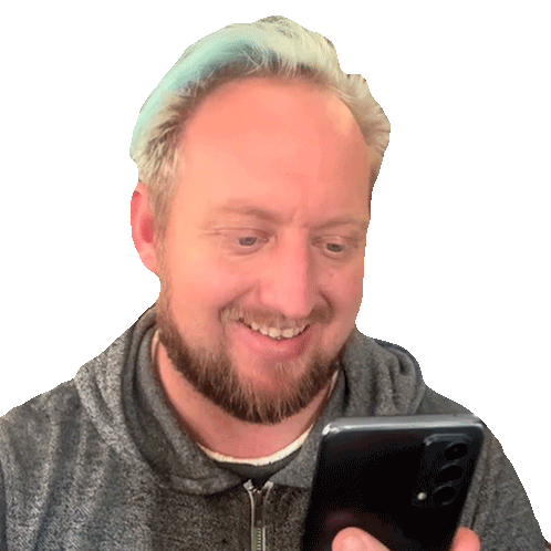 Djhuntsofficial, a man with a beard and blue-tipped hair, looks confused and surprised while staring at his phone.