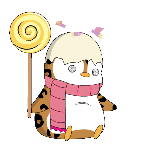 a cartoon penguin wearing a pink scarf and holding a yellow lollipop