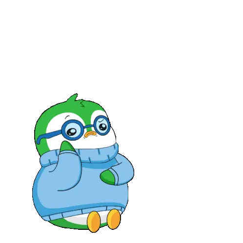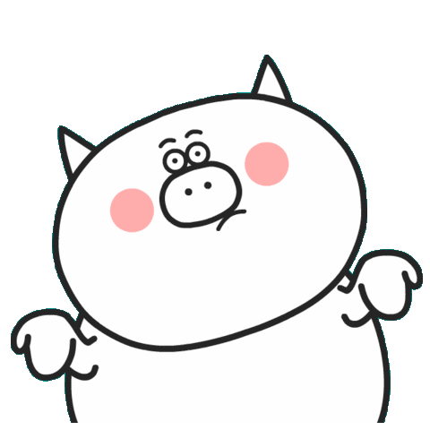 A cute pig-like character with rosy cheeks and mismatched eyes looks confused and uncertain, shrugging its shoulders.