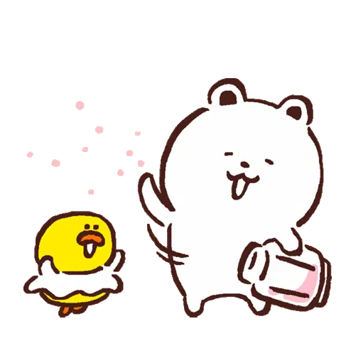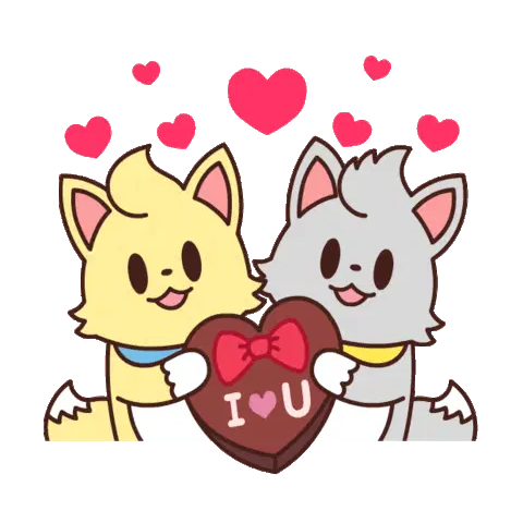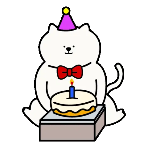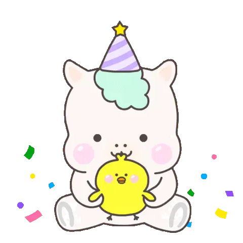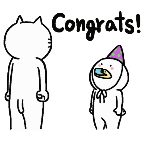 A cute cat congratulates a character in a party hat, surrounded by colorful confetti, celebrating a happy event.