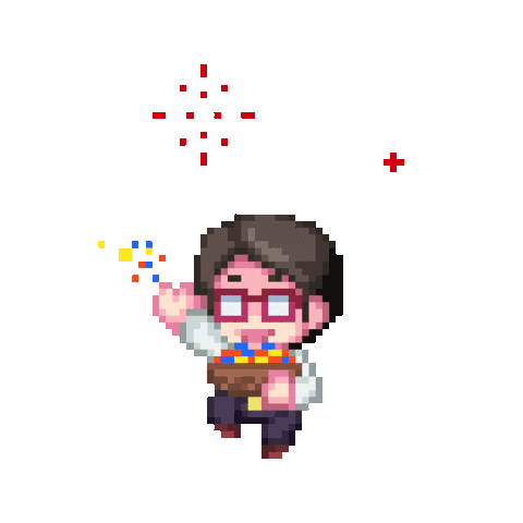 A pixel art character with glasses holds a basket of colorful items as red celebratory confetti-like pixels appear around them.