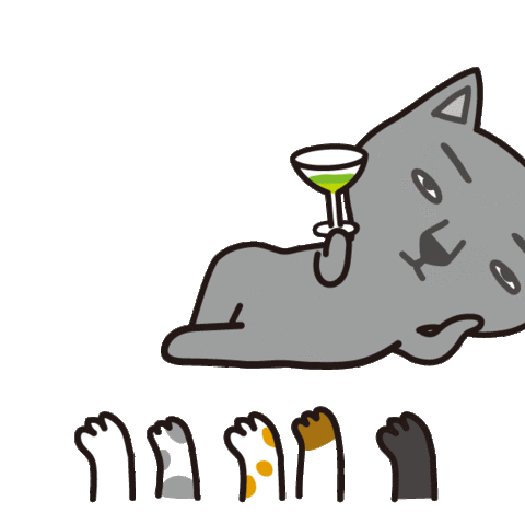 A relaxed gray cartoon cat lies down, holding a green cocktail, surrounded by confetti, celebrating with various cat paws below.