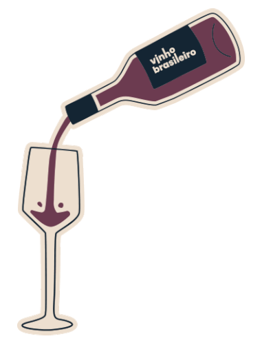 A stylized bottle of Brazilian wine (vinho brasileiro) pours dark red wine into a classic wine glass.