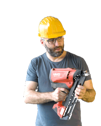 A construction worker, possibly Josef or Benes, holds a Hilti nail gun, ready for work on a project.