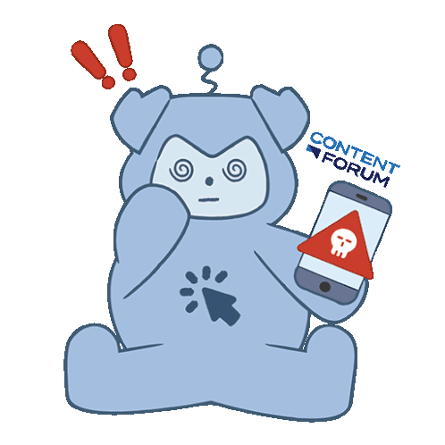 A mischievous teddy bear holds a cell phone displaying 'Itchy Fingers' and 'Content Forum' text, a playful warning.