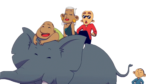 Happy cartoon characters, including a man, woman, and child, joyfully riding a large elephant, all smiling brightly.