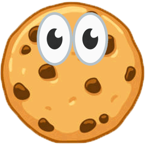 A cute cartoon chocolate chip cookie, known as Kuhlerkeks, blinks its large, pill-shaped eyes in an animated way.