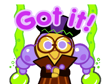 Alchemist Cookie from Cookie Run, a cartoon character with glasses and a purple hat, enthusiastically says 'Got it!'