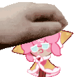 Strawberry Crepe Cookie, the pink-haired character from Cookie Run Kingdom, held by a dog.