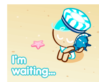 Peppermint Cookie from Cookie Run sits on a sandy beach, holding a small dolphin, with the caption "I'm waiting...".