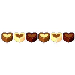 A row of pixel art heart-shaped cookies or chocolates in various shades of brown and cream, gently moving.
