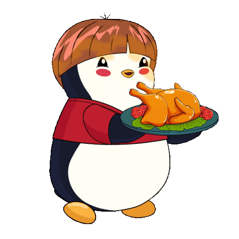 A cute penguin character, wearing a red shirt and brown hair, proudly presents a perfectly roasted chicken on a platter.