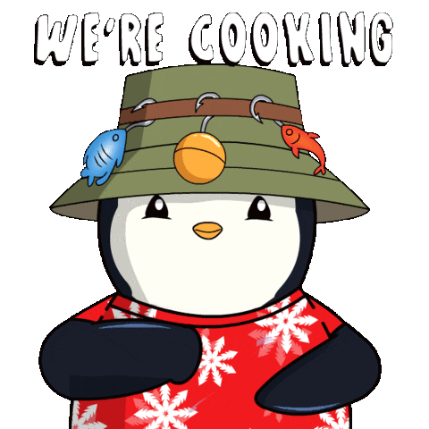 A cool Pudgy Penguin in a fishing hat and Hawaiian shirt declares 'WE'RE COOKING', perfect for hype and anticipation.