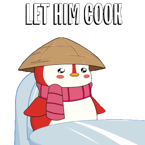 Two animated penguins, one wearing a conical hat and scarf, the other an afro and sunglasses, with the text 'LET HIM COOK'.