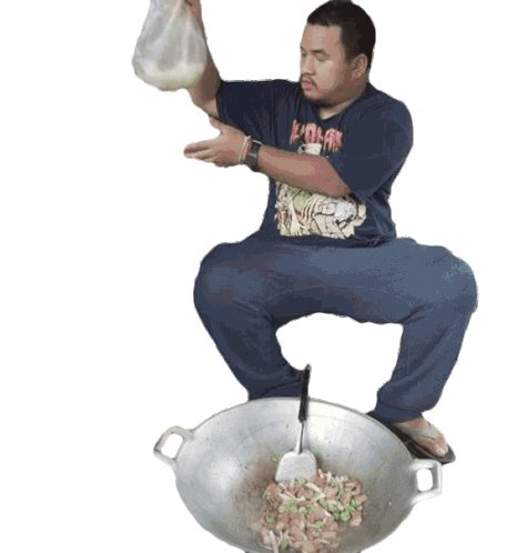 A man preparing a Thai dish in a large wok, adding ingredients and stirring with a spatula.
