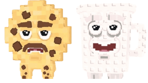 a pixel art drawing of a cookie with a mustache next to a pixel art drawing of a yogurt