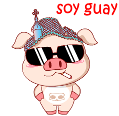 A cool cartoon pig wearing sunglasses and a unique hat, smoking a cigarette, with 'Soy Guay' text.