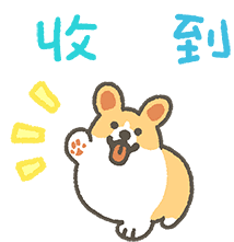 Cute animated sticker of a fluffy Corgi dog with the Chinese characters '收到' (Received) appearing above it.