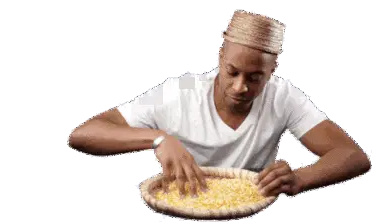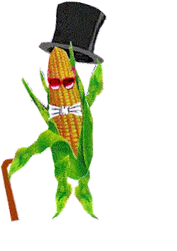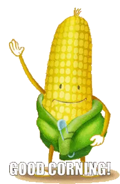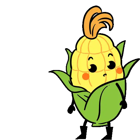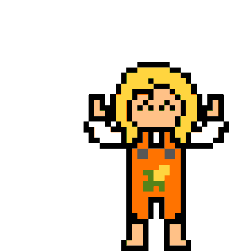 A charming pixel art girl with blonde hair and orange overalls featuring a green corn design, standing with arms raised.
