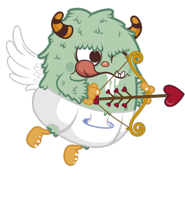 Cornelio, a cute green monster resembling Cupid, winks and sticks out its tongue while holding a heart-tipped bow and arrow for Valentine's Day.
