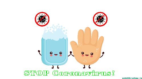 A cute cartoon of a bar of soap and a hand holding hands, with the message 'STOP Coronavirus!' to promote hygiene.