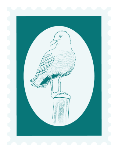 A detailed drawing of a seagull perched on a wooden pole, presented within an oval frame on a teal postage stamp design.