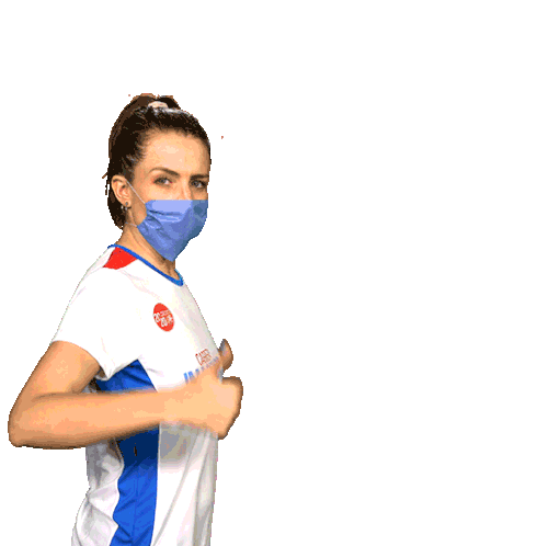 A woman in a blue mask gives a thumbs-up, encouraging to "Run with Emotion" with animated confetti.