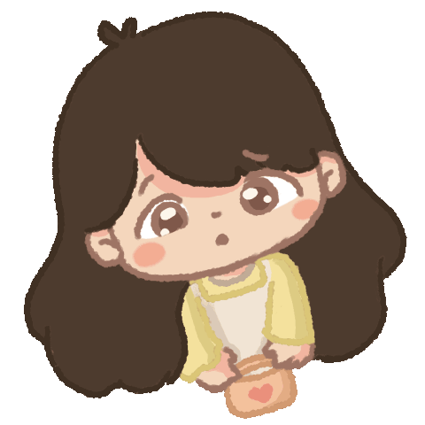 A Cosytales girl with brown hair blinks, looks shocked, and holds a heart-decorated bag.