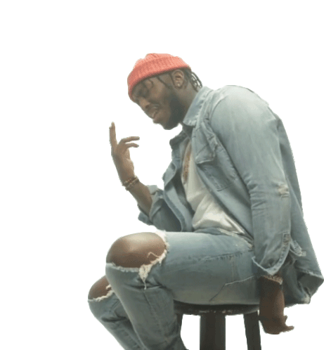 Pardison Fontaine makes a counting or emphasizing gesture with his hand, sitting on a stool in a red beanie and denim.
