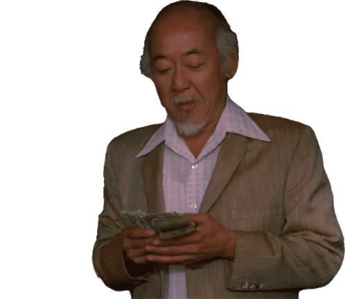 Mr. Miyagi from The Karate Kid Part II happily counts a stack of cash, showing his satisfaction with the money.