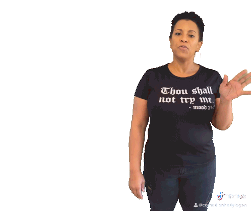 Comedian Holly Logan warns, 'Thou shall not try me - mood 24-' while gesturing emphatically.
