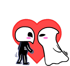 A cute animated sticker of a skeleton and a ghost sharing a sweet kiss in front of a vibrant red heart, symbolizing love.