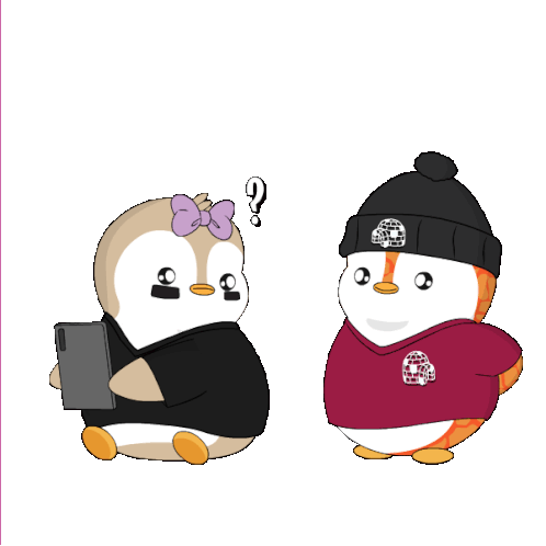 Adorable penguin couple sticker, one with a tablet, the other in a beanie, conveying apology, love, and cheer.