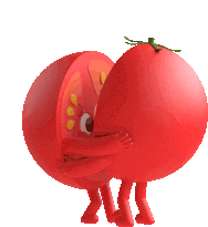 A sweet animated sticker showing two cartoon tomatoes, one whole and one sliced, embracing with a pink heart floating above them, symbolizing love.