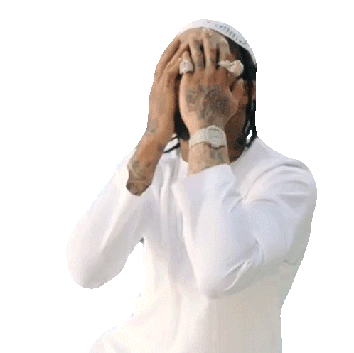 Dave East covers his face with his hands, appearing ashamed or embarrassed, wearing a white kufi and thobe.
