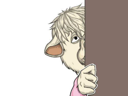 Cowcow, a cute cartoon character, peeks playfully from behind a brown wall, wearing a pink shirt.