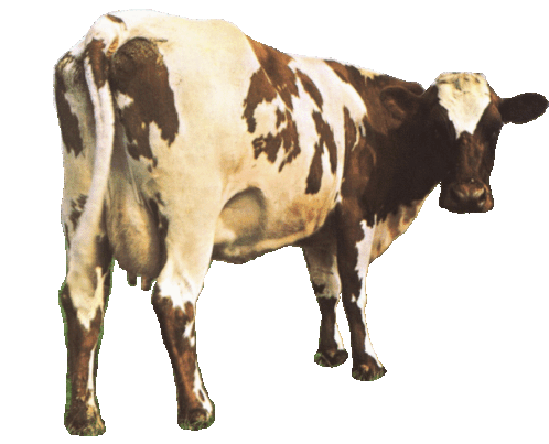 An animated brown and white cow sticker, playfully moving its head and body, perfect for expressing a fun mood.