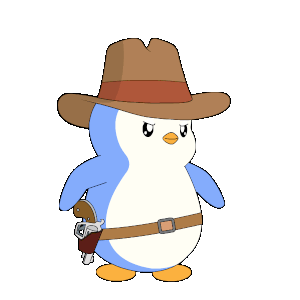 A determined Pudgy Penguin, dressed as a cowboy with a hat and a gun in its holster, ready for a wild west adventure.