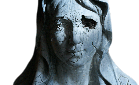 A haunting close-up of a cracked statue of a woman's face, featuring a broken eye and unsettling details.