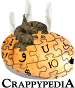 Humorous Crappypedia logo parody featuring a potato globe, a pile of poop, and the text 'CRAPPYPEDIA'.