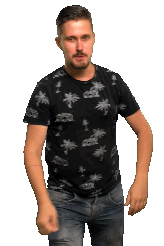 Crazy R Gmb dances energetically, wearing a black palm tree shirt and jeans, making a punching motion.