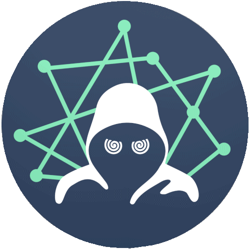 A spinning 3D Crazypool logo featuring a mysterious hooded figure with swirling eyes and a green geometric star pattern.