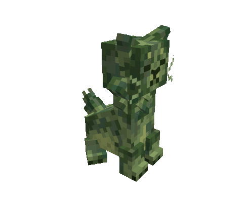 Animated 3D pixel art sticker of a green, camouflage-patterned Creeper cat, continuously rotating on its axis.