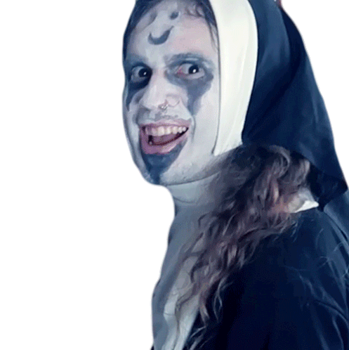 Bradley Hall in a nun costume with black and white face paint, giving a creepy, intense stare and smile.