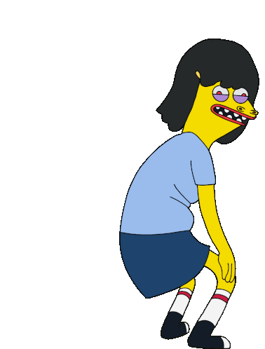 Creepz Lagmi, a yellow cartoon character with black hair, squats with a wide, toothy smile and red eyes.