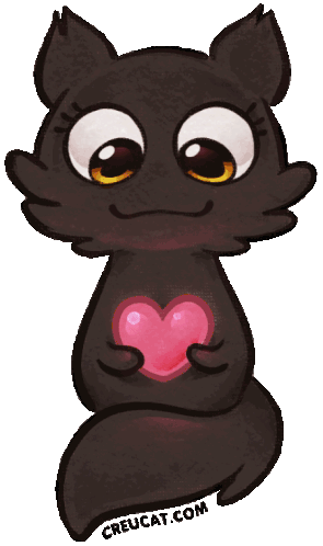 Creucat, a cute black cat character, holds a glowing, beating pink heart, symbolizing love and kindness.